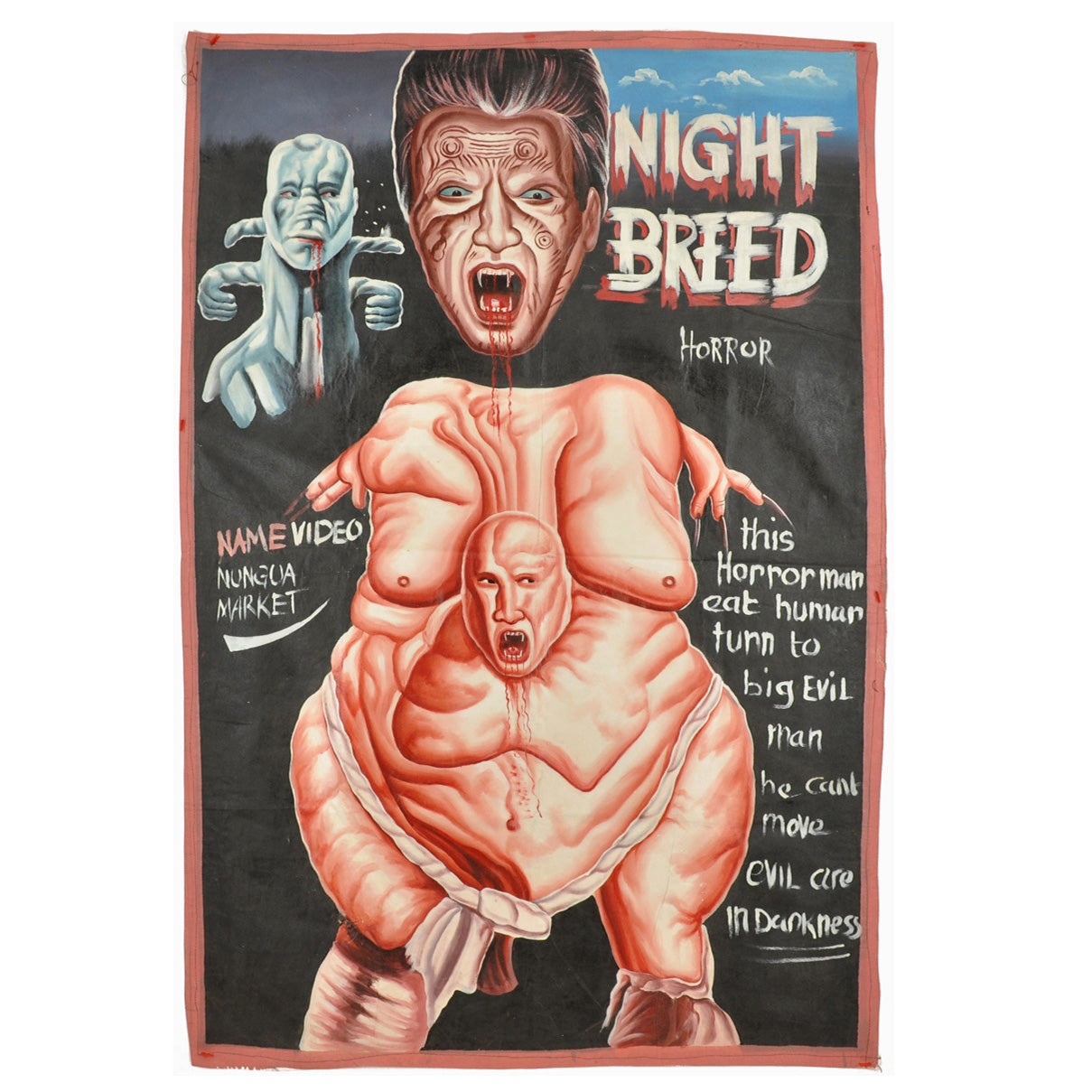 Cette affiche vibrante et captivante peinte à la main représente "Nightbreed", un film d'horreur fantastique sombre. L'affiche, fabriquée sur des sacs de farine recyclées d'artistes ghanéens locaux, capture l'essence intense et mystique du film avec des couleurs audacieuses et des illustrations dynamiques.